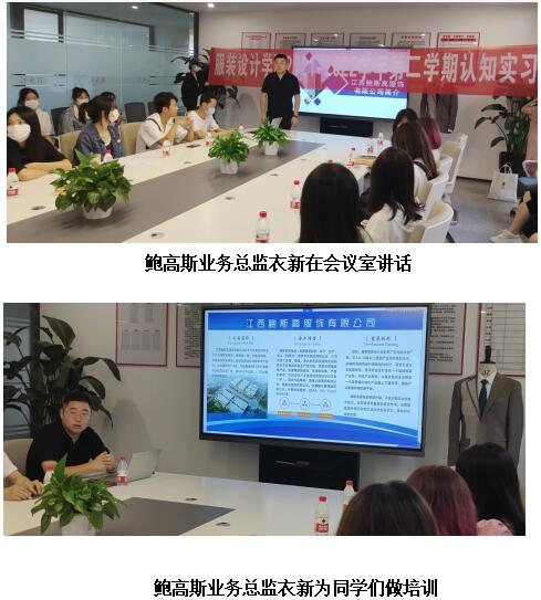 9点40分,全体师生顺利到达江西鲍高斯服饰有限公司。鲍高斯业务总监衣新在企业会议室为大家举办了隆重的接待仪式。江西员工会会长郑高政(94级学长)首先跟同学们分享了当年的学习和工作经历,勉励同学们珍惜实习机会,提升个人能力。接着业务总监衣新通过PPT为同学们介绍了鲍高斯服饰有限公司生产经营状况,鲍高斯服饰有限公司是一家集服装研发设计、生产加工、销售为一体的专业制造西服企业,和国内外多家知名服装大品牌合作,打造服装供应链的产业园。然后衣总又为同学们做培训指导,介绍了西装的整个工艺流程、工艺设备和车间流水线,为同学们接下来的车间参观做好了准备。